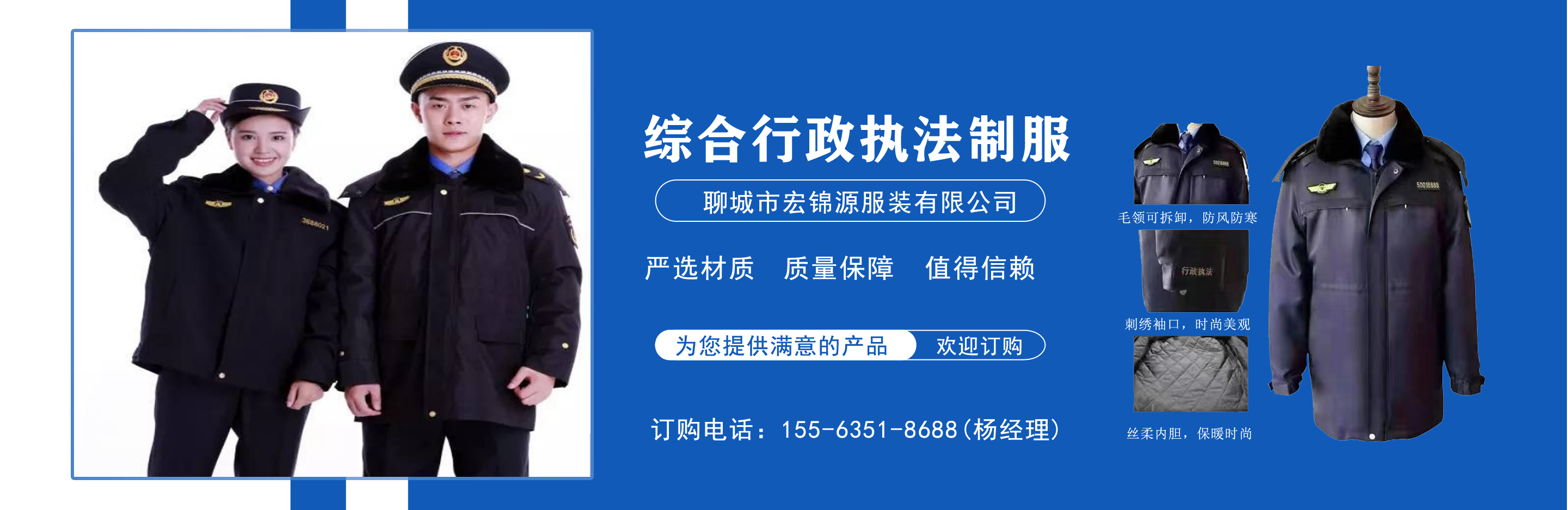 聊城市宏錦源服裝有限公司位于江北水城—山東聊城,地理位置優越,交通便利。公司主營綜合行政執法制服,交通執法服裝,應急管理執法標志服,市場監督管理標志服,農業執法服裝,生態環境保護制服,文化市場執法服,城管標志服裝廠,衛生監督制服,六部門標志服廠家等,值得信賴! 公司生產的標志服裝據有造型美、板型新、多次水洗不退色、不變型、不起泡。 “認真辦事,踏實做人”是宏錦源的企業精神,我們的宗旨是:“用服務與真誠來換取你的信任與支持,互惠互利,共創雙贏!”我公司愿與國內外各界同仁志士竭誠合作,共創未來企業目標:在已選定的服飾領域中,成為行業的卓越者。 經營理念:追求產品卓越,為用戶提供完美、高效的服務。...